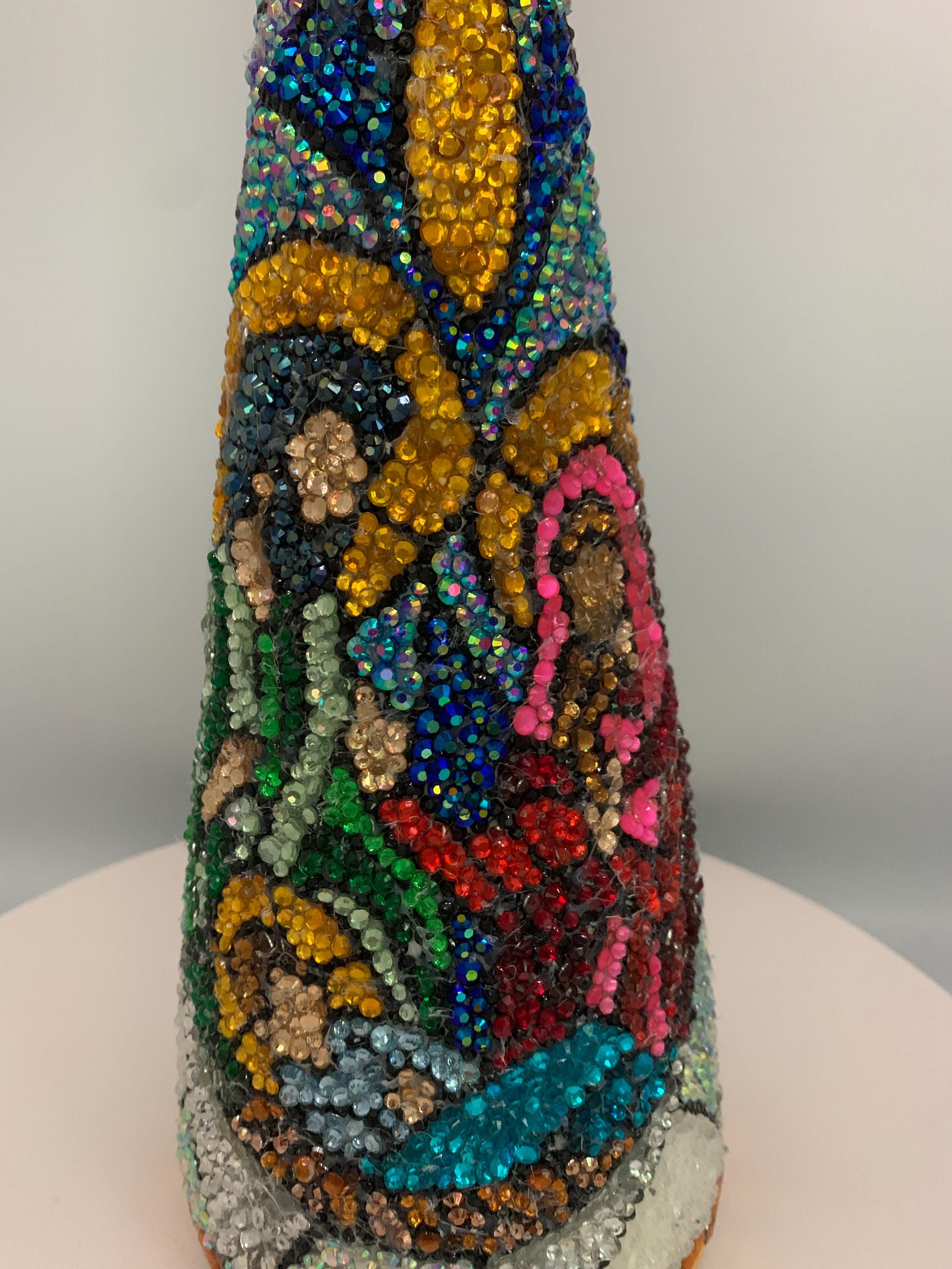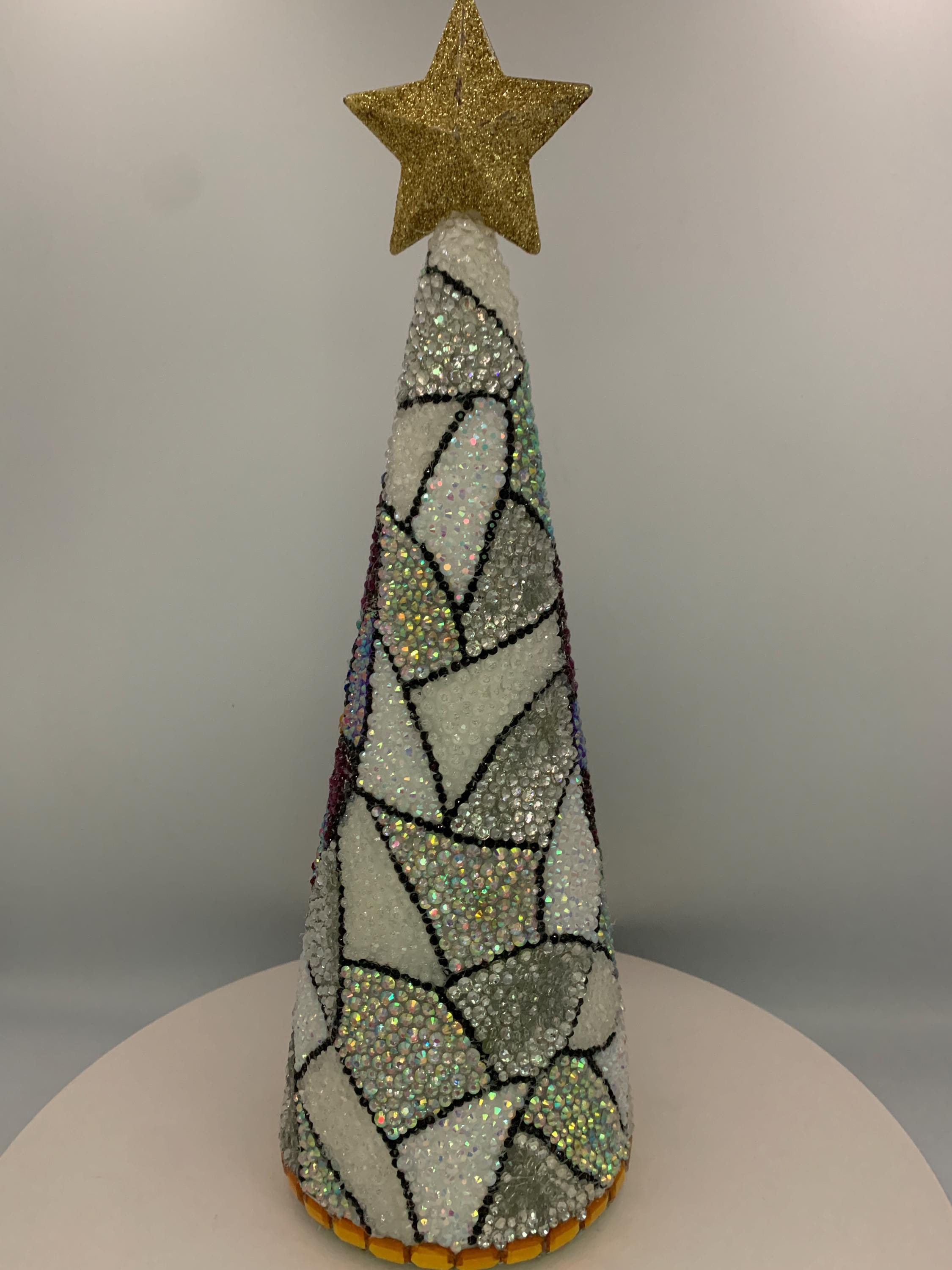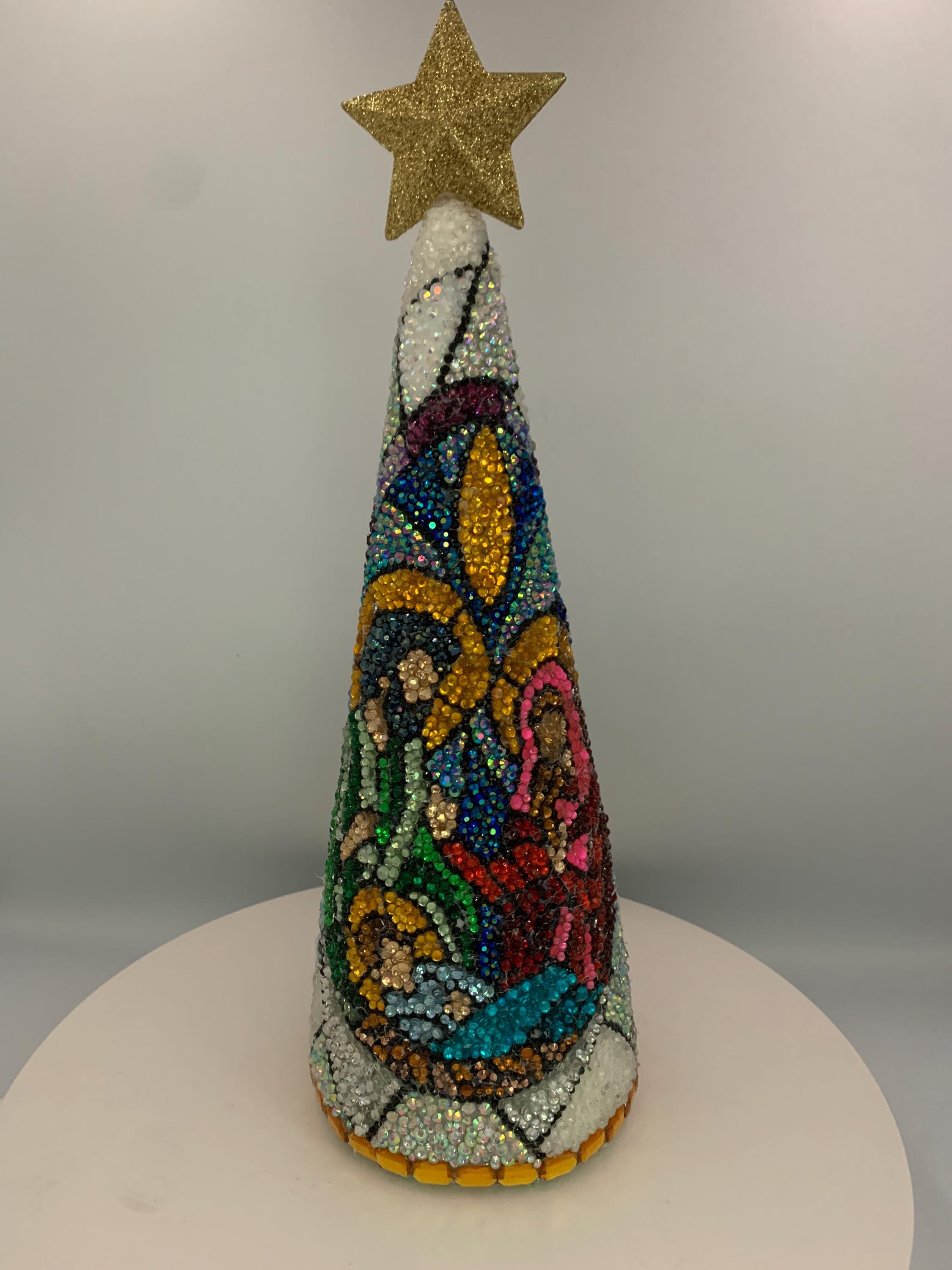 This tree is sums up the spirit of Christmas. Mimicking stained glass seen in churches and cathedrals, this beautiful 14" tabletop rhinestone tree has the Virgin Mary, and her husband, Joseph, celebrating the birth of Jesus. I do craft trees that are tributes to famous people, or movies, or sports - but this tree? THIS is what Christmas is all about. As with all my other crafted items, this is a one of a kind and will never be duplicated.