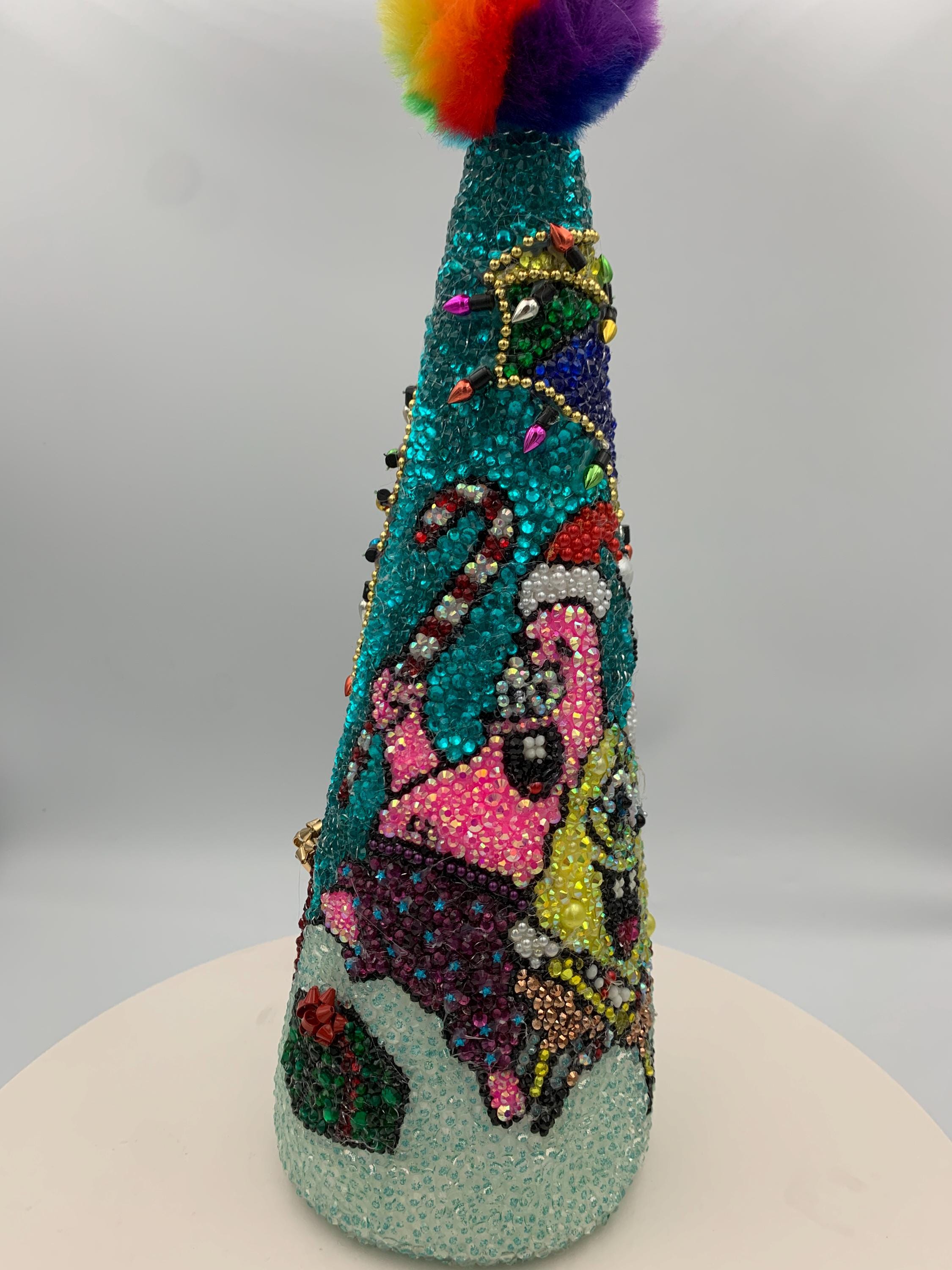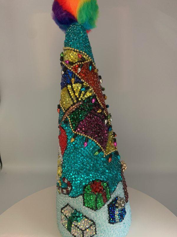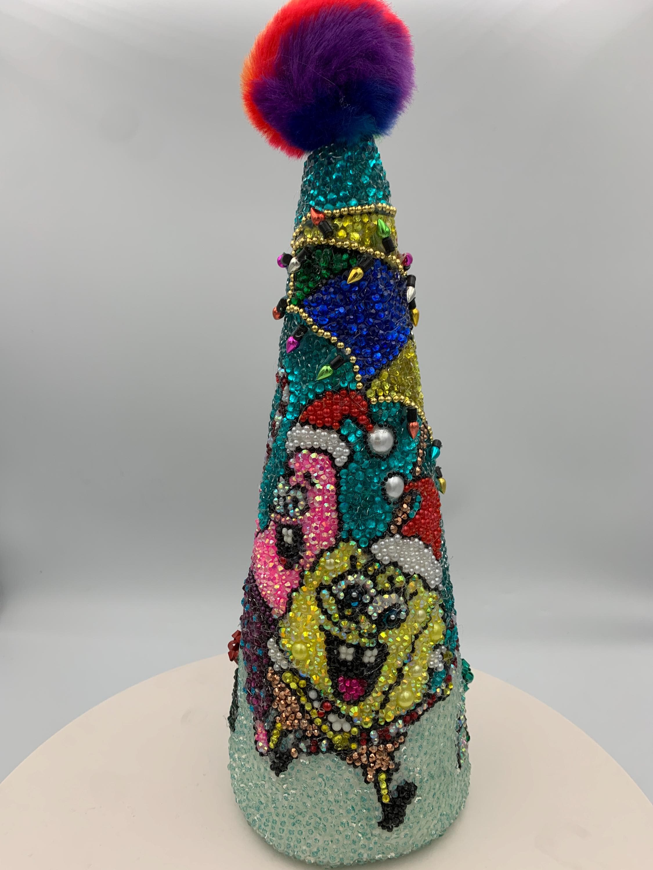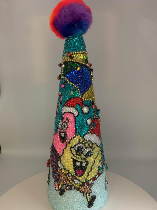 Here's Bob and his best friend Patrick frolicking under the sea - their beach umbrellas has been blinged out with holiday lights (no, these don't actually work!) and there are presents for their friends scattered about. Great gift for the fan on your Christmas list! As with all my pieces, this is a one of a kind, never to be duplicated. Each tree is completed handmade....one rhinestone at a time. Tabletop tree measures about 14" in height.