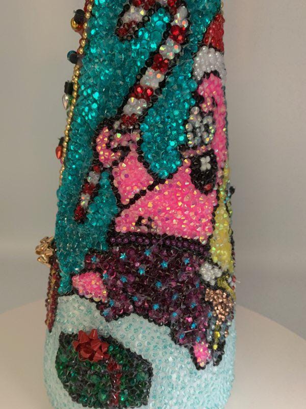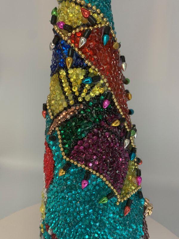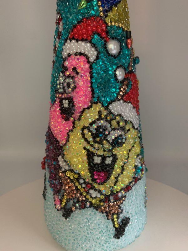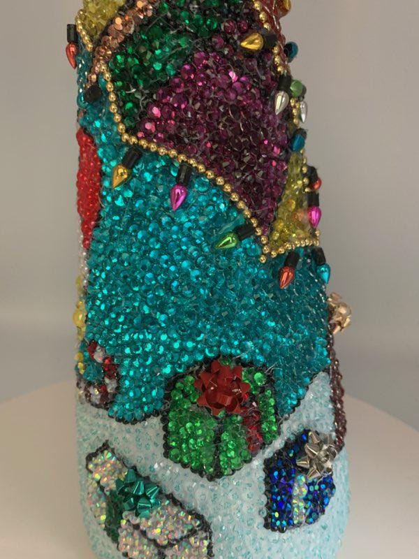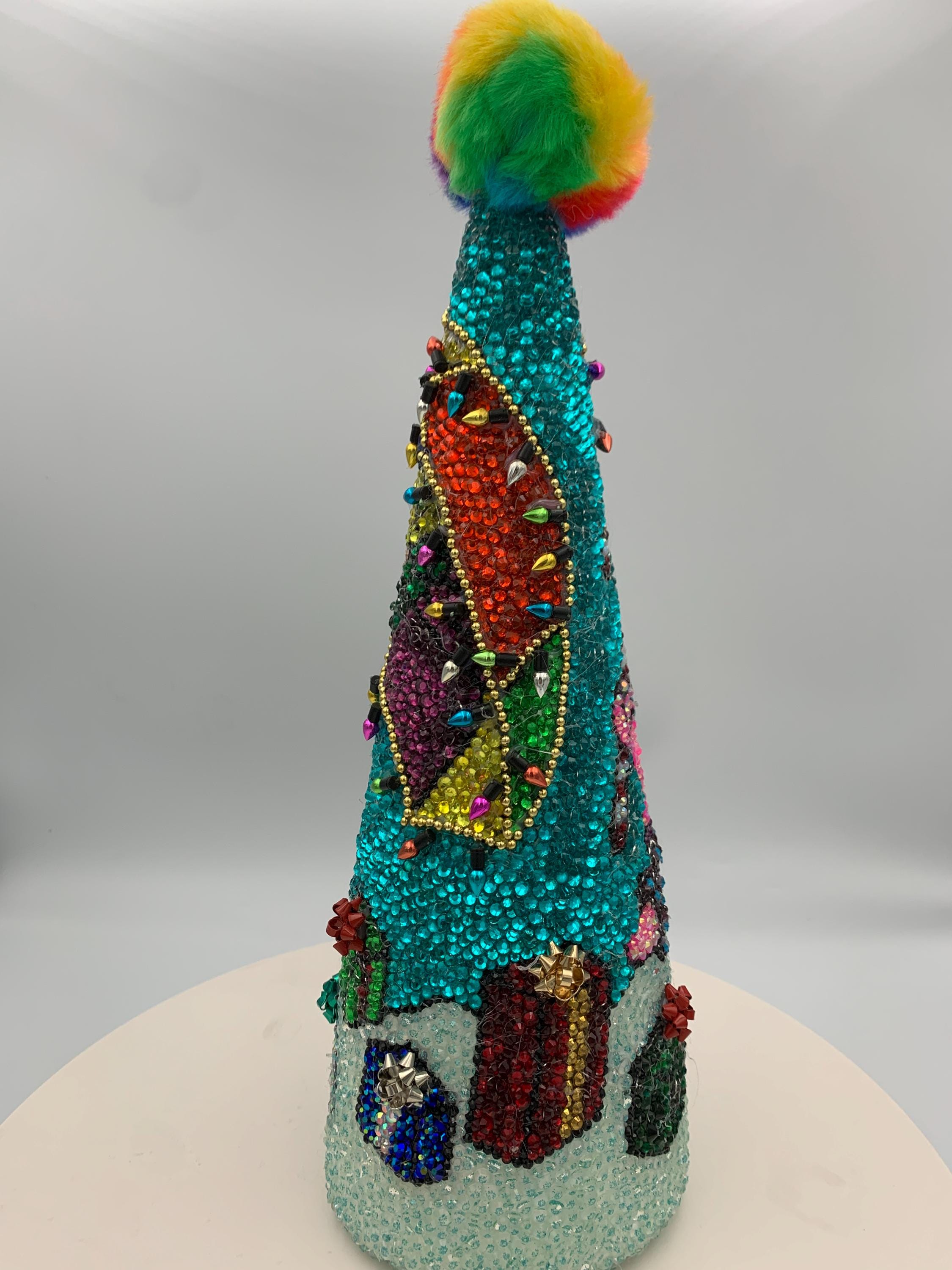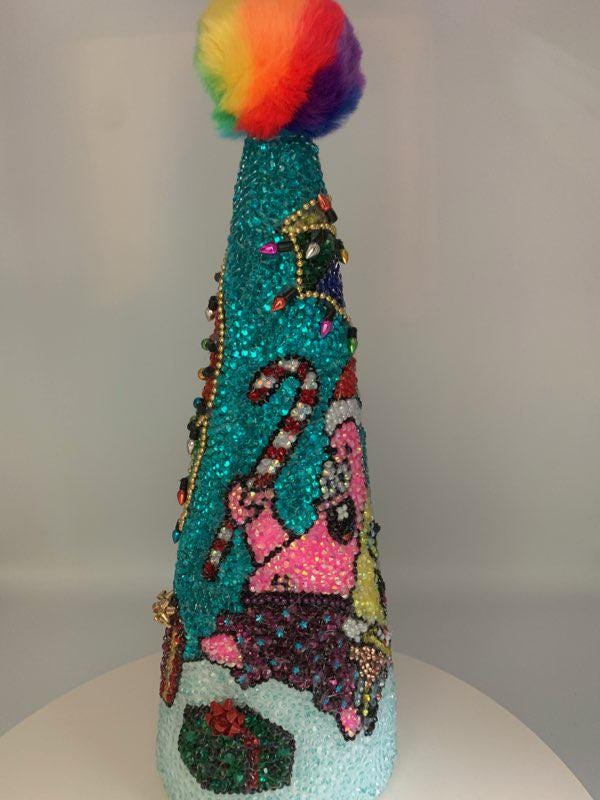 Here's Bob and his best friend Patrick frolicking under the sea - their beach umbrellas has been blinged out with holiday lights (no, these don't actually work!) and there are presents for their friends scattered about. Great gift for the fan on your Christmas list! As with all my pieces, this is a one of a kind, never to be duplicated. Each tree is completed handmade....one rhinestone at a time. Tabletop tree measures about 14" in height.