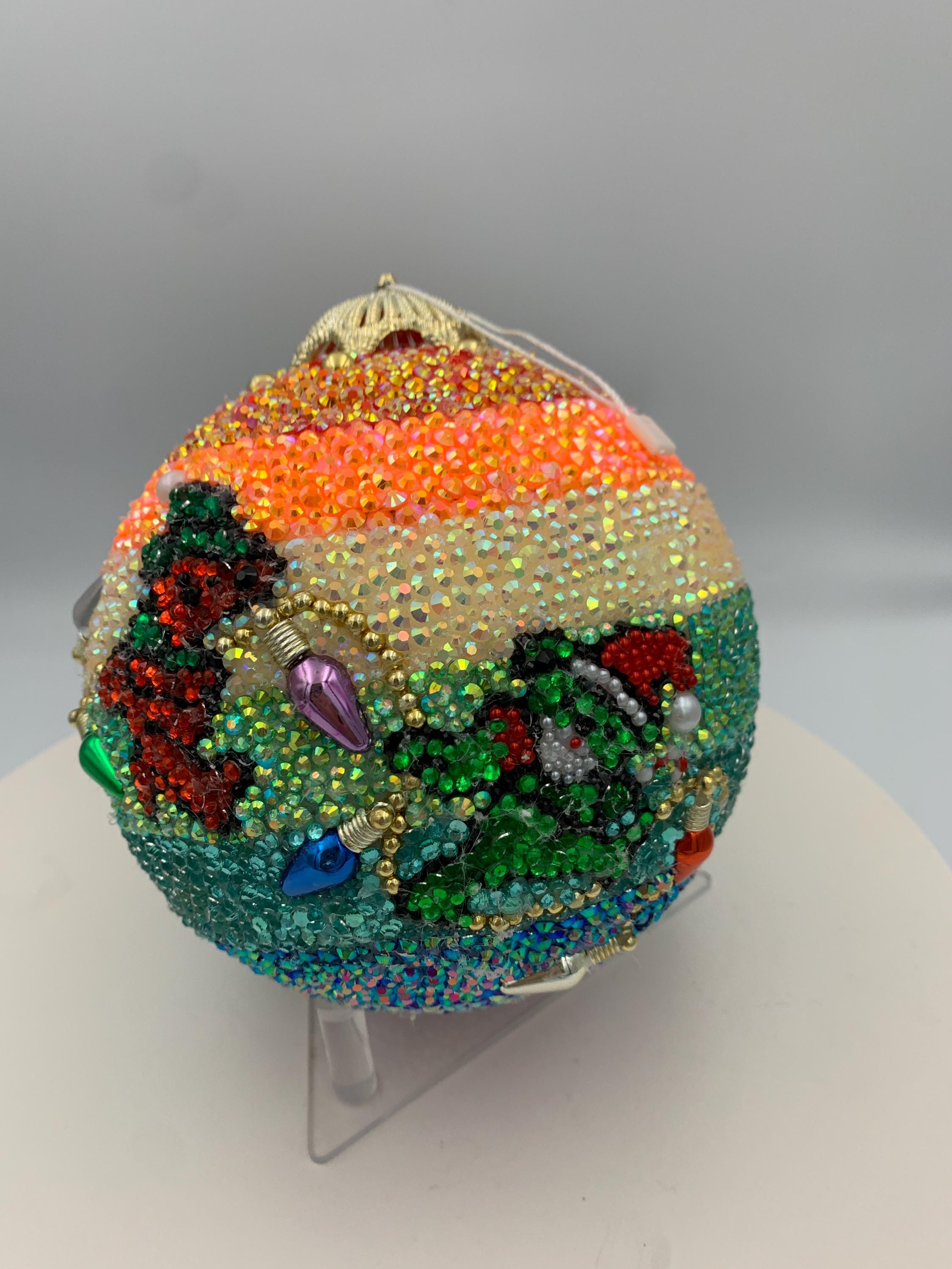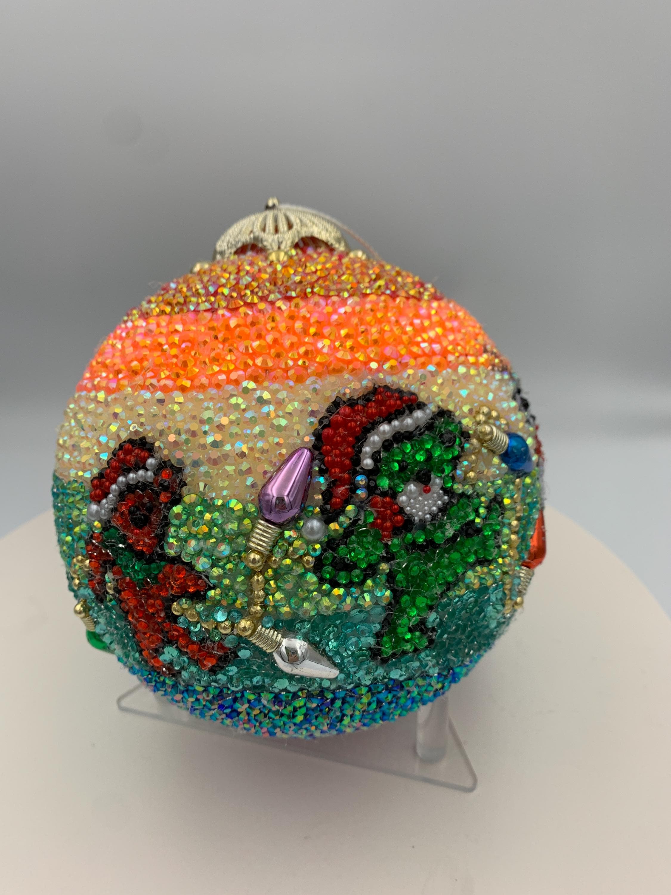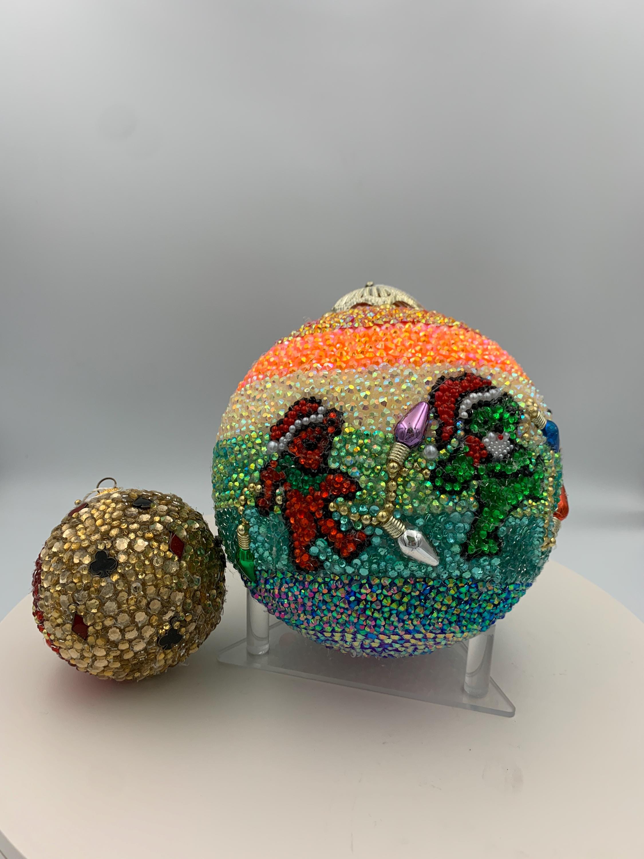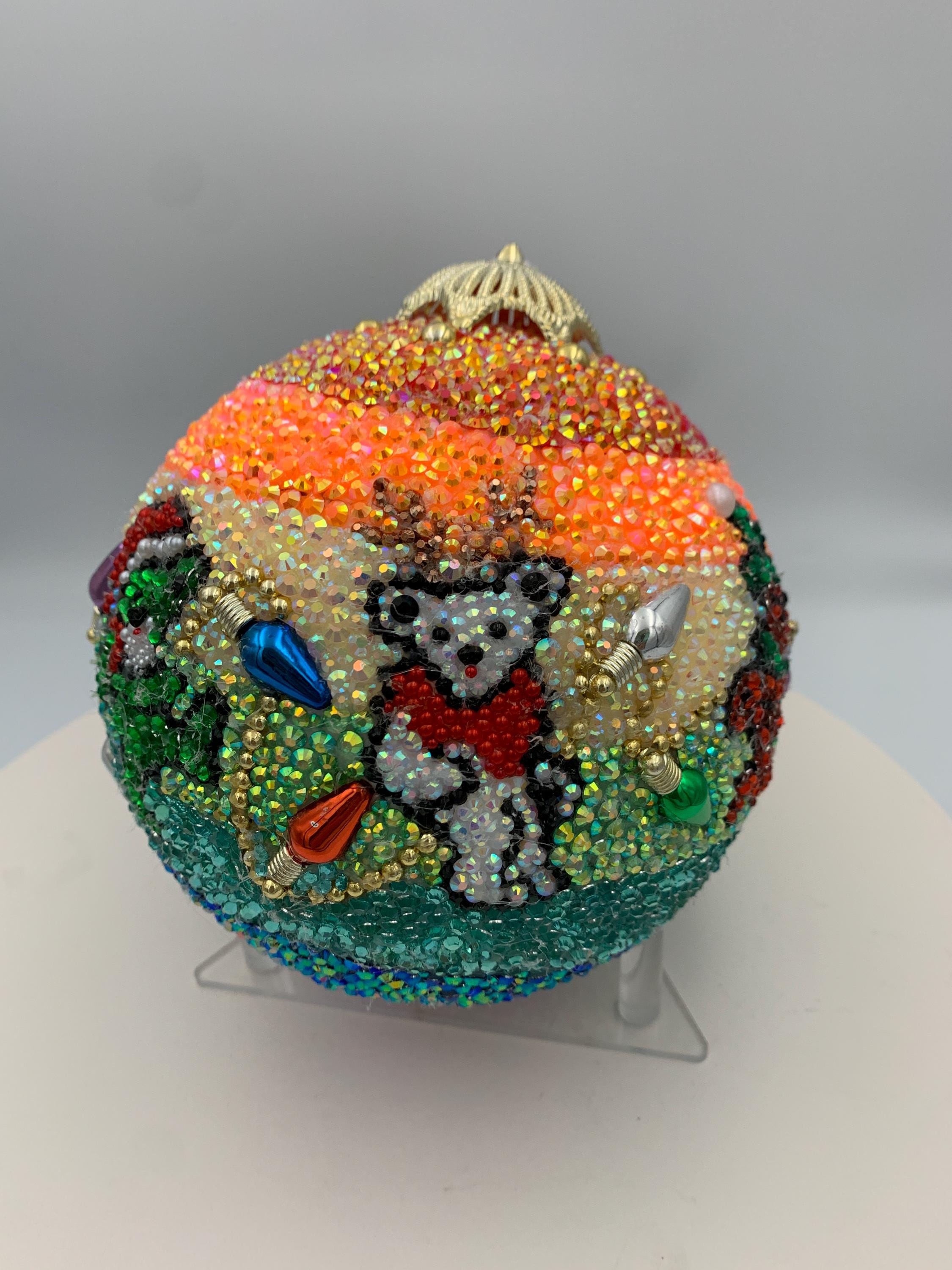 This is a large 5" Ornament Ball, covered with rhinestones. The iconic Grateful Dead bears are all in red, green and white holiday colors and sport holiday trim - Santa hats, beards and candy canes! The background is their trademark rainbow of colors - sparkly as rhinestones do! As with all my trees, one of a kind, never to be duplicated and completely handmade...one rhinestone at a time! If you're a fan, or have someone who is on your Christmas list, grab it before someone else does! NOTE: the second ornament in the photo is just to illustrate the size...only the Grateful Dead ornament is being sold.