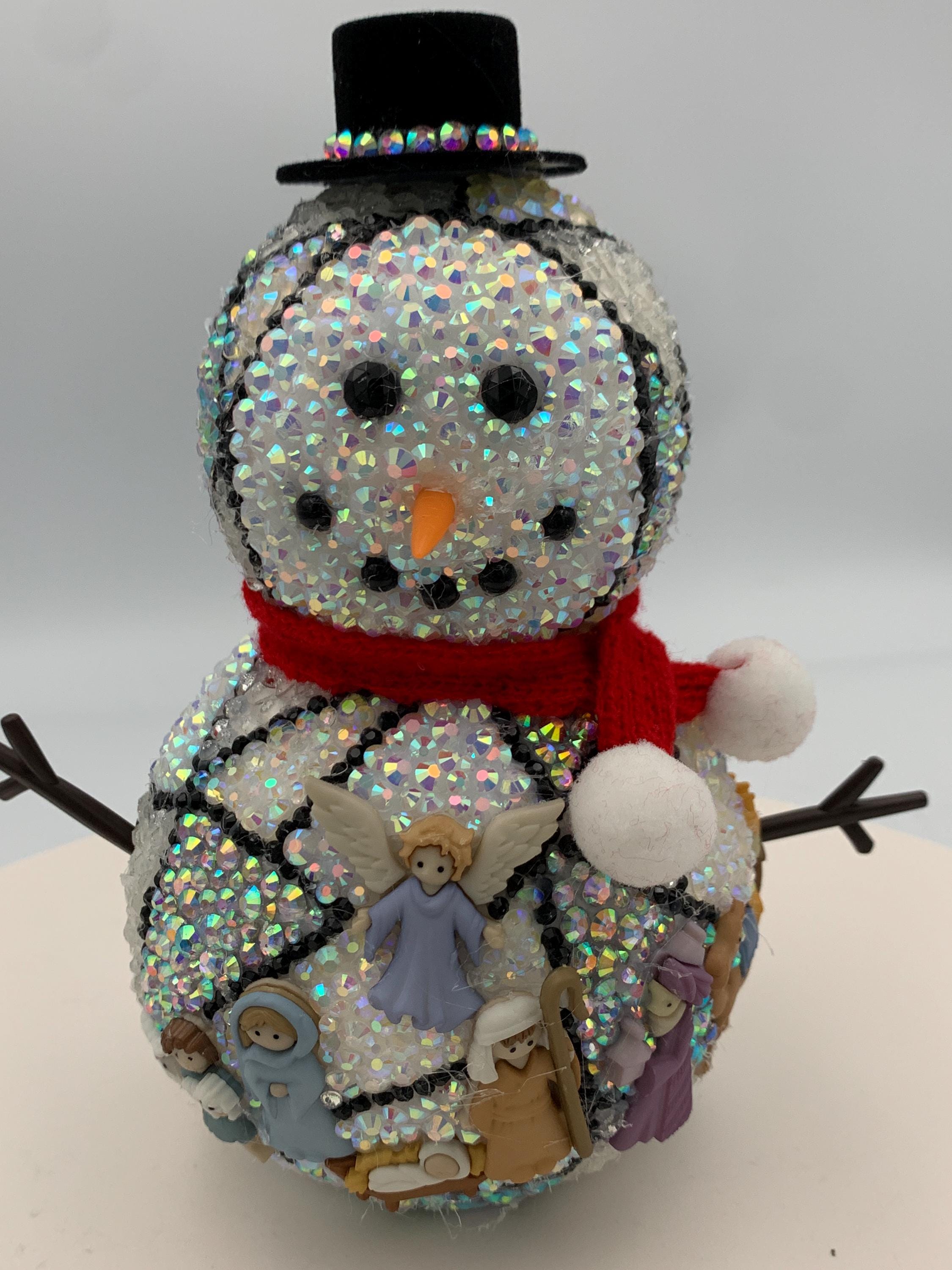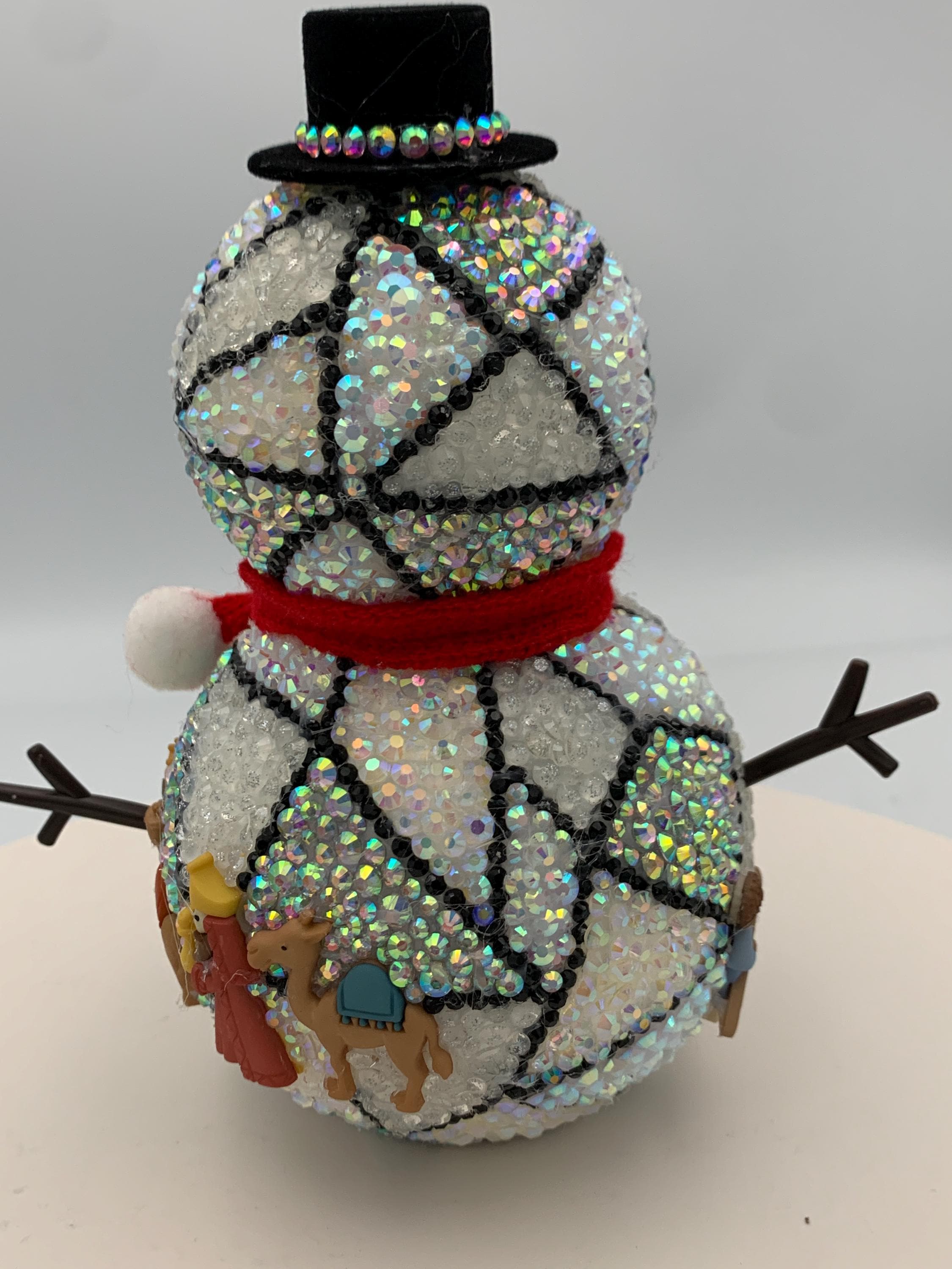 NEW for 2026! This is a sweet 6" rhinestone snowman - so cute with his carrot nose and scarf. This snowman is created to simulate stained glass, and there are Nativity charms attached to create the scene. Very sweet and as with all my trees and balls, a one of a kind that will not be duplicated.