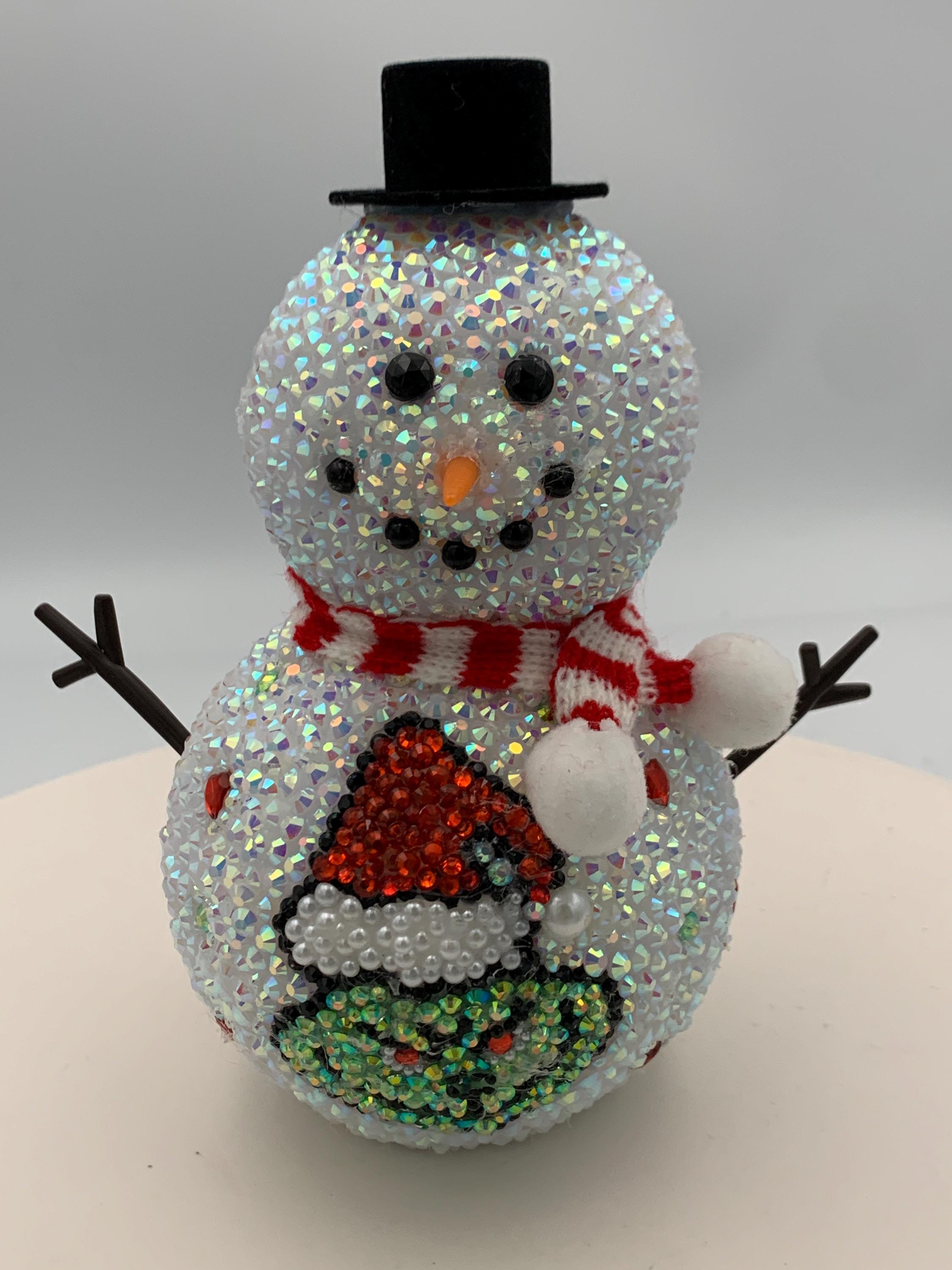 NEW for 2026! This is a sweet 6" rhinestone snowman - so cute with his carrot nose and scarf! Featured on his lower half is the Grinch and on the back, Grinch's hand dangling a heart. These are (pardon the pun!) Snow Cute! Perfect to add to any Grinch collection! and like all my other items, a one of a kind that will not be duplicated.