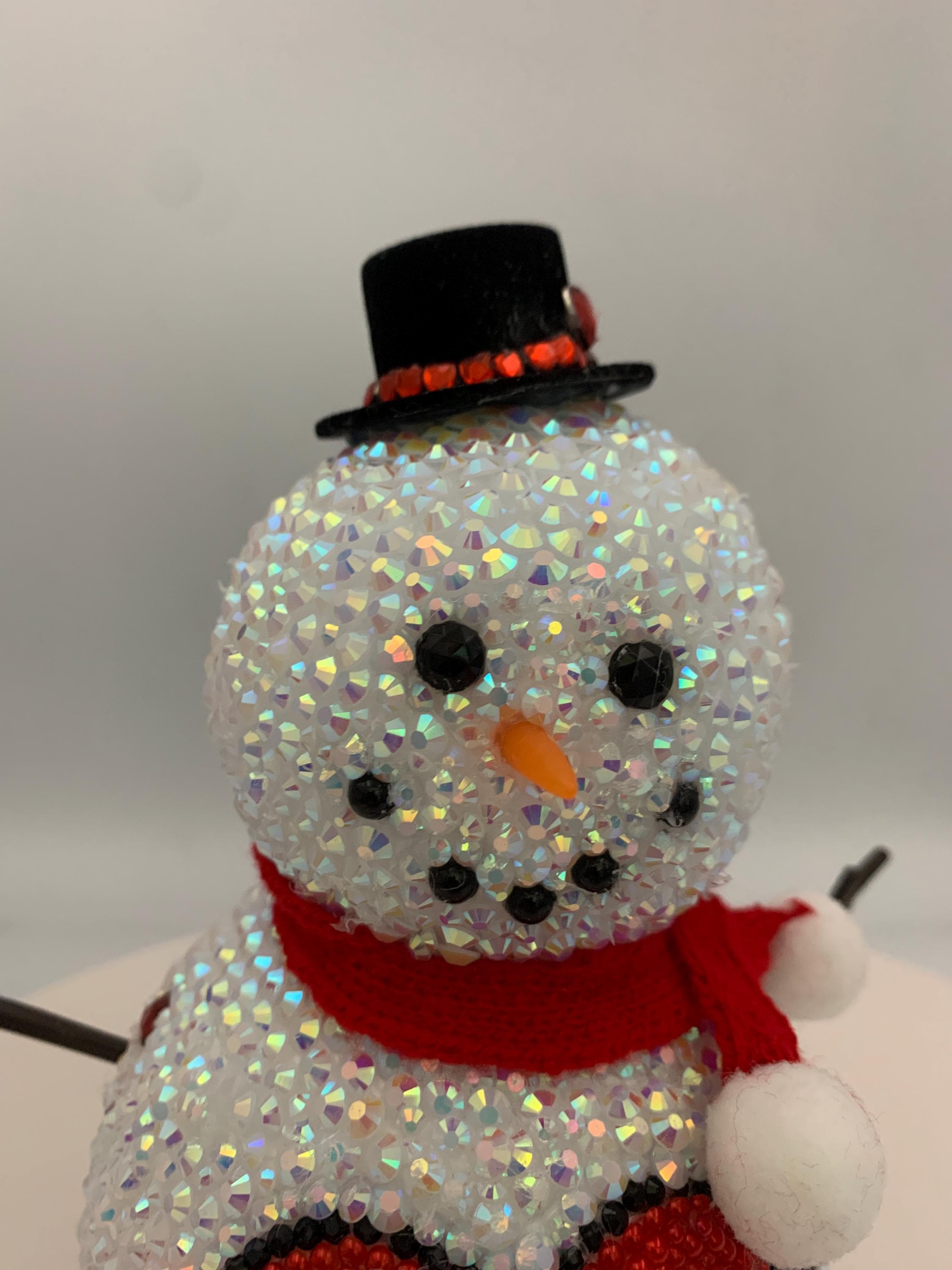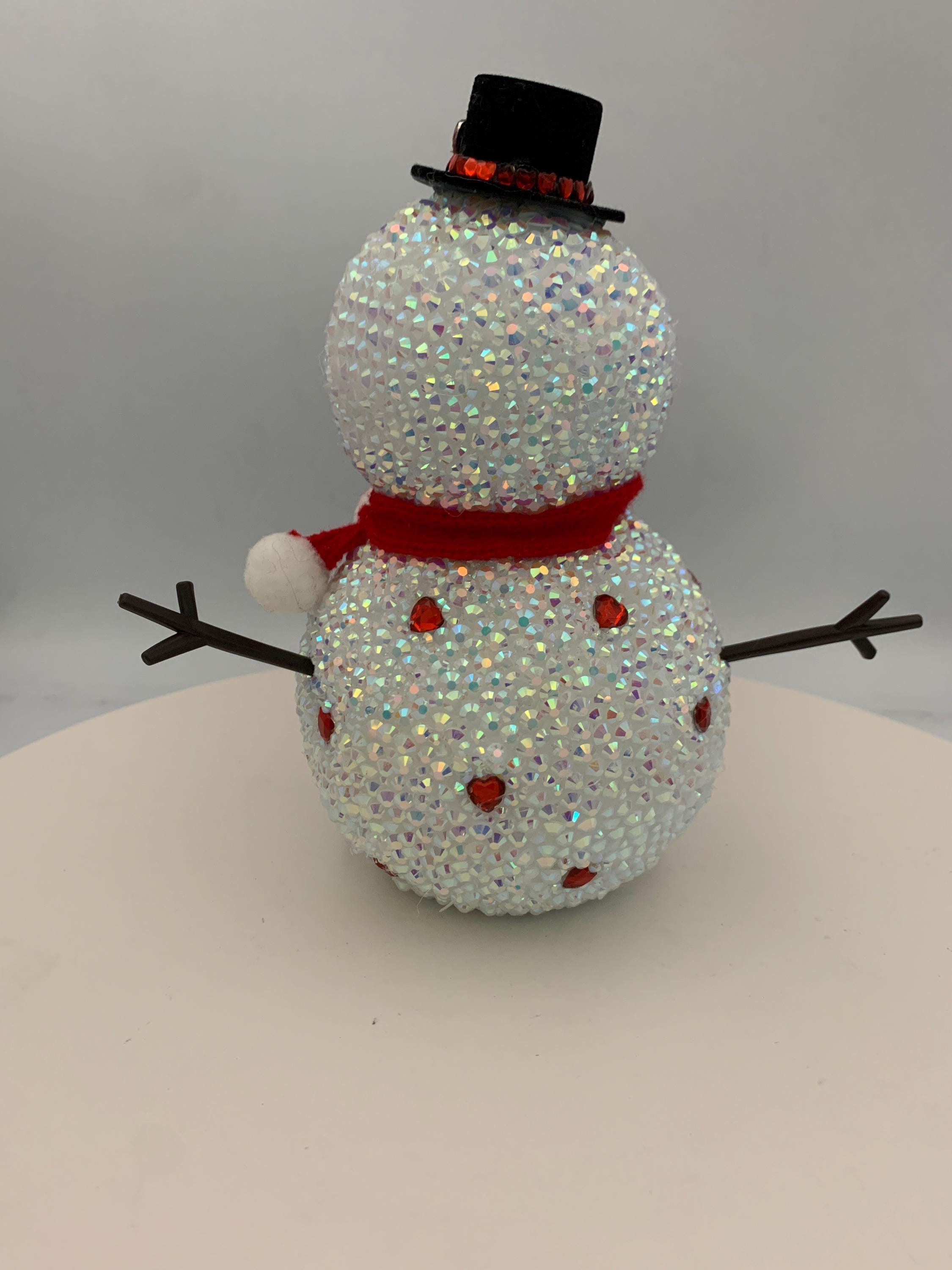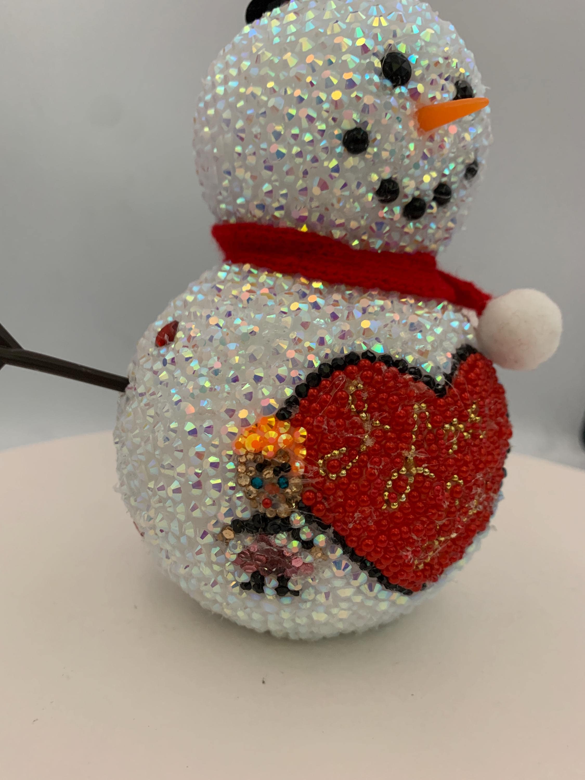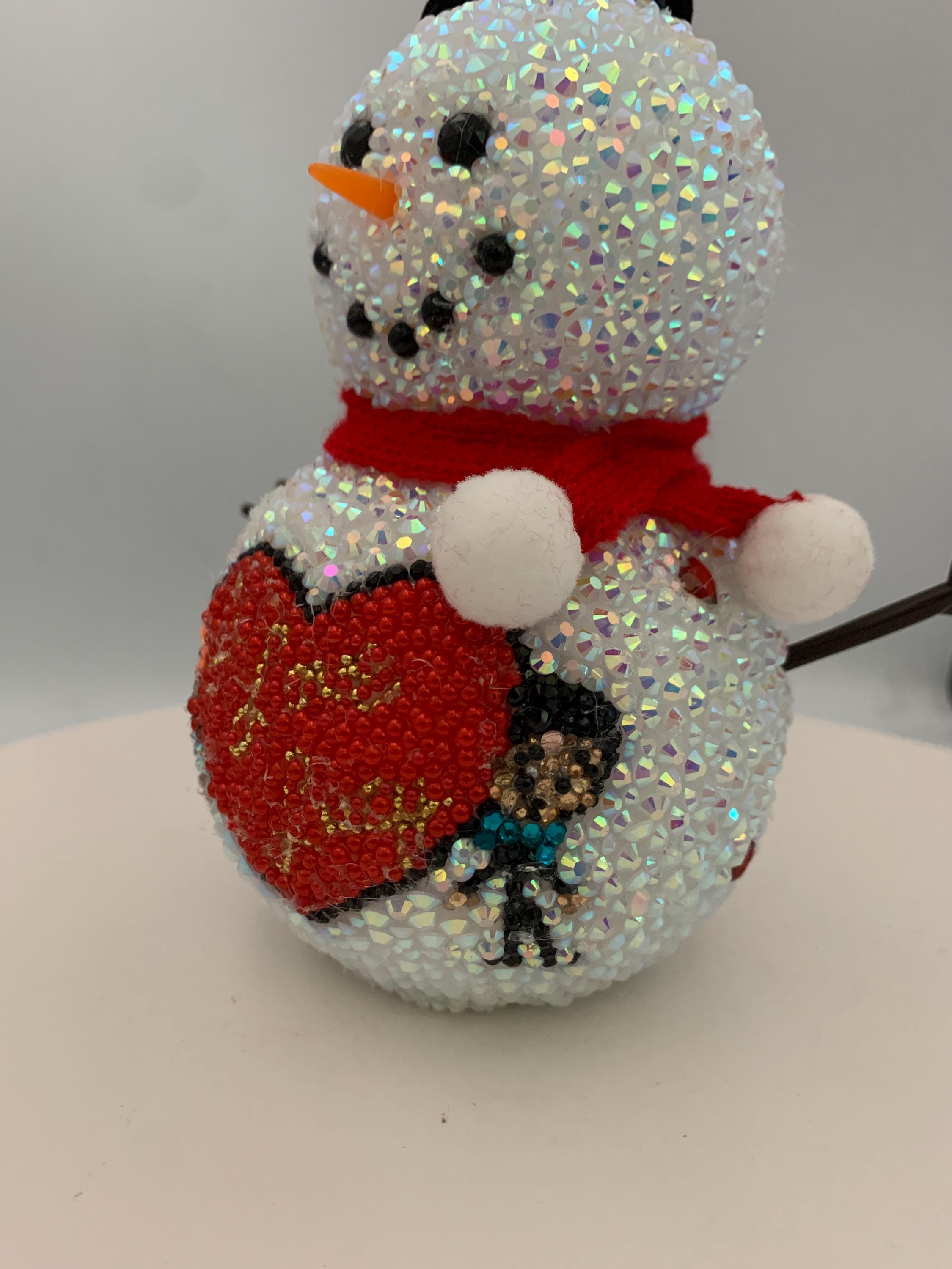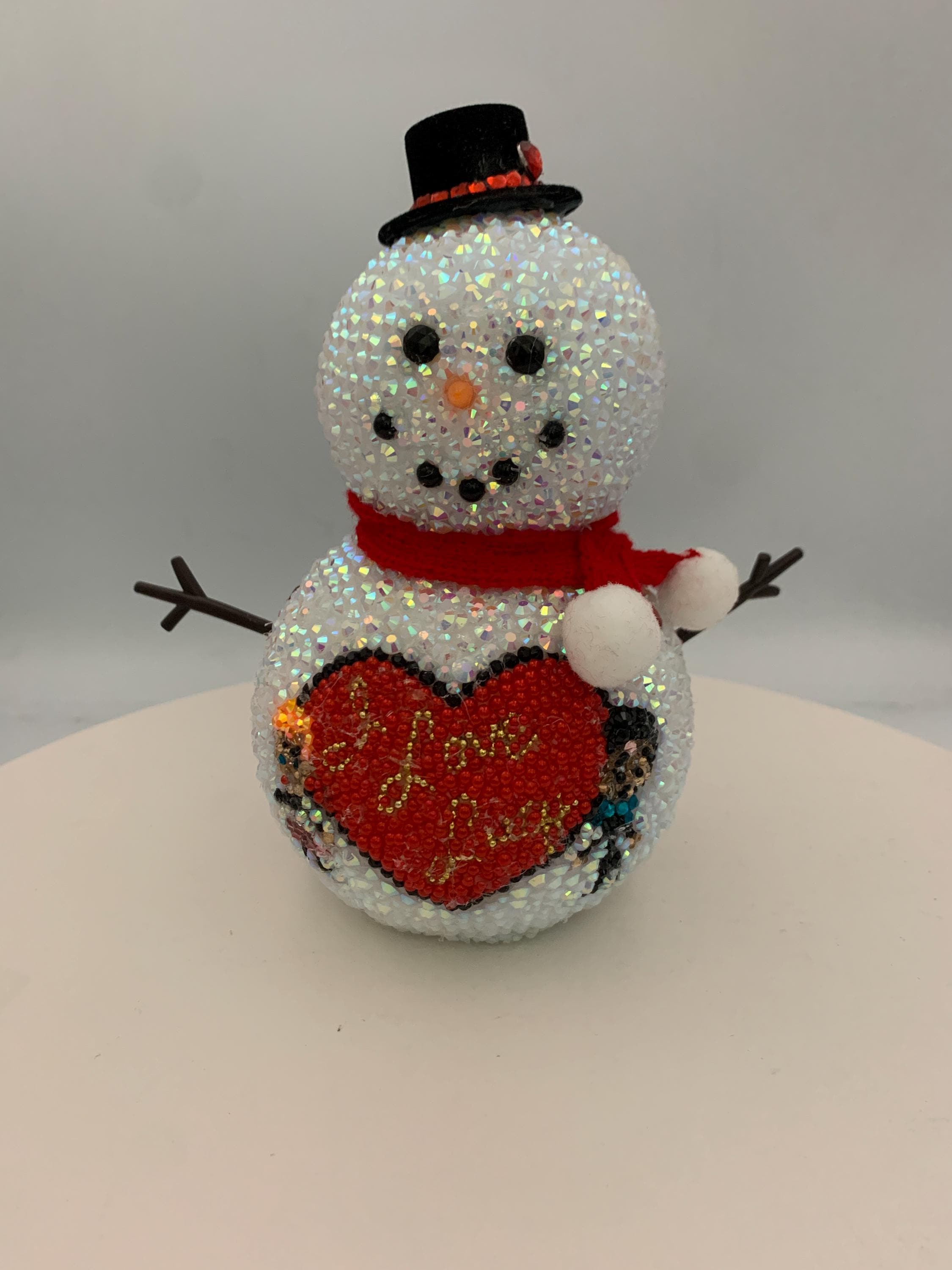 Who doesn't love Lucy? This adorable 6" snowman is entirely covered in rhinestones, and featured on his lower snowbelly is the iconic "I Love Lucy" heart - and the original stick figures of Lucy and Ricky! Snow cute! and like all my items, one of a kind, never to be duplicated.