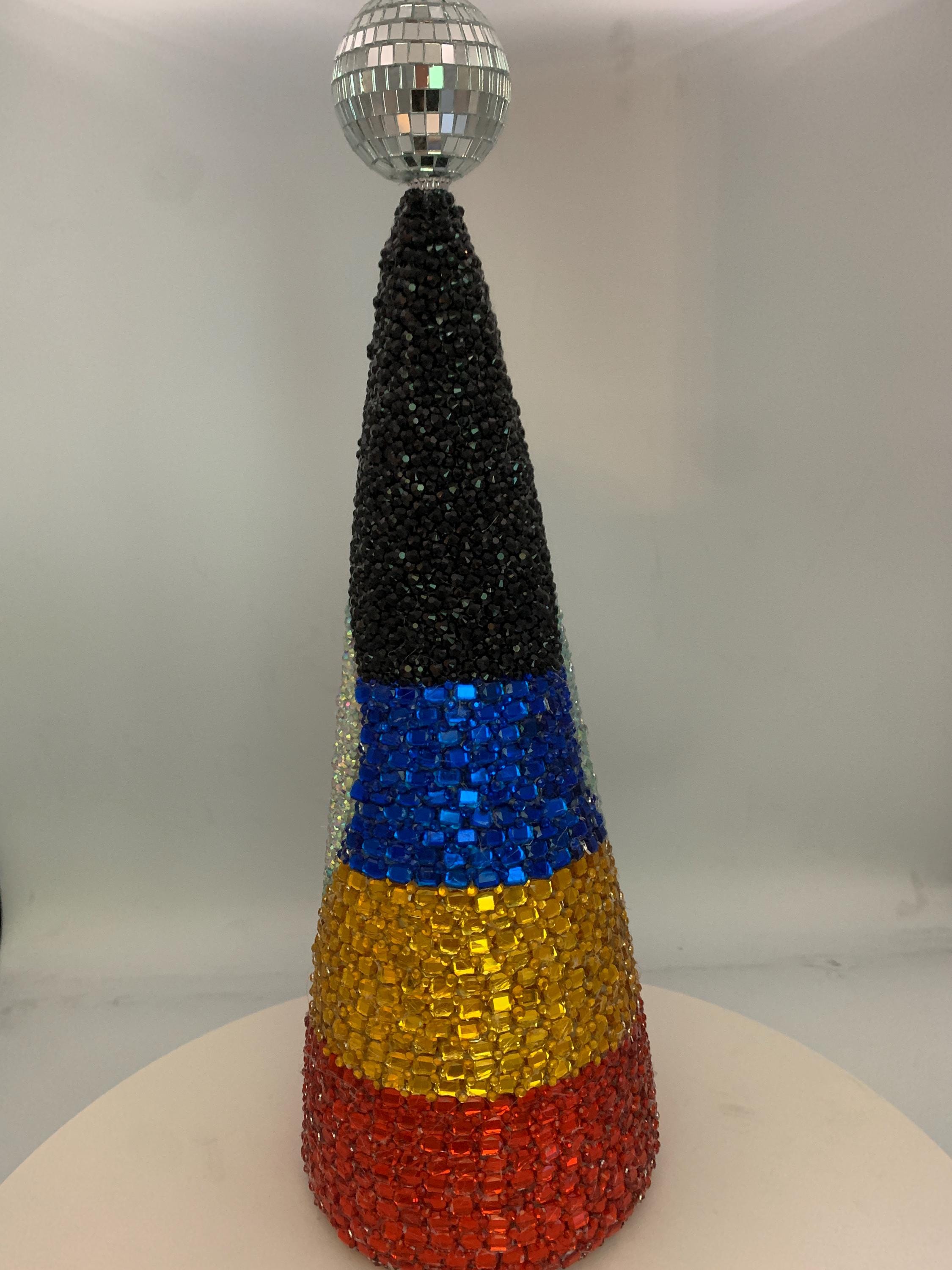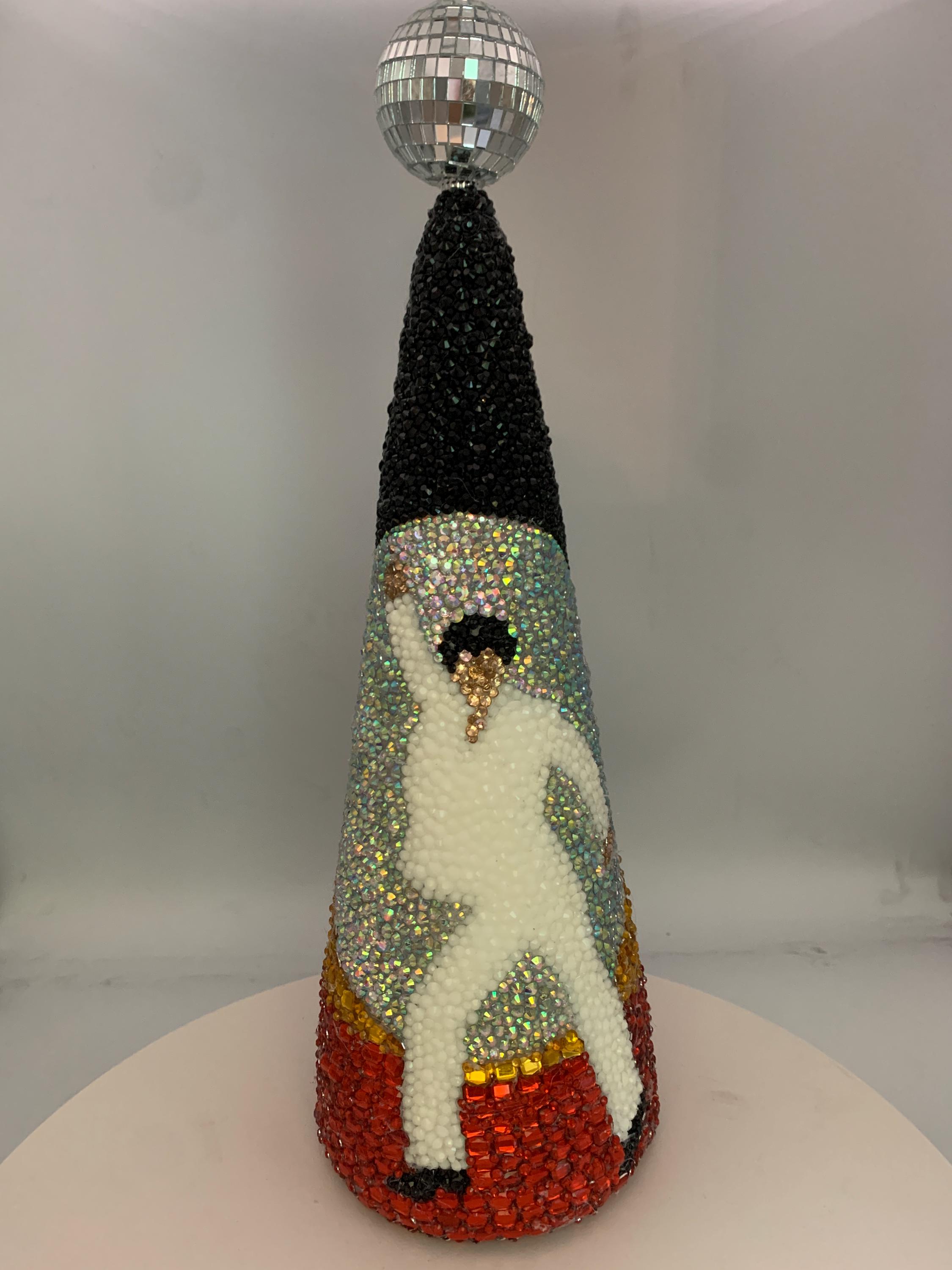 This one is for all you Saturday Night Fever Disco babies - here's Travolta in his iconic dance pose, in THAT white suit against a silver "disco" ball. The rest of the ball is in the rectangle red, gold and blue of the album cover, with the top cone in black and topped with a disco ball! Perfect for anyone who loved the 70's - and still boogies! And as with all my items, this is a one of kind, never to be duplicated.